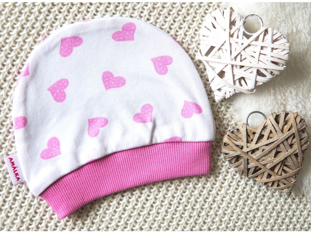 Jednovrstvá bavlněná čepička v něžném potisku růžových srdíček.