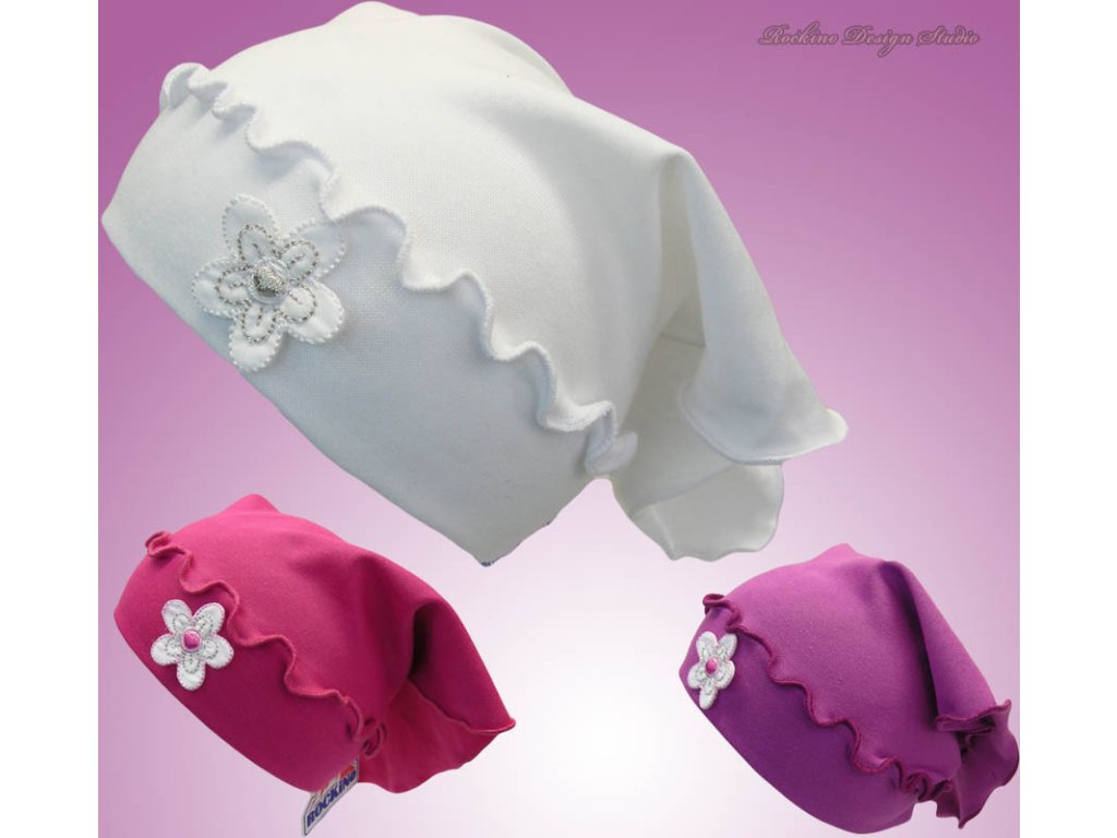 2. jakost. Dívčí šátek z pružného úpletu v bílé barvě. Zdobený kanýrkem a vyšívanou aplikací kytky.