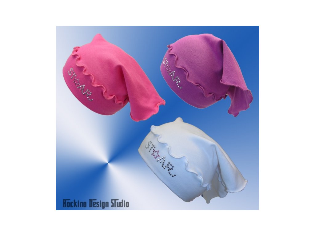 Dívčí šátek z pružného úpletu. Zdobený kanýrkem a flitrovou aplikací "STAR". Dvouvrstvý patent kolem čela přes ouška.
