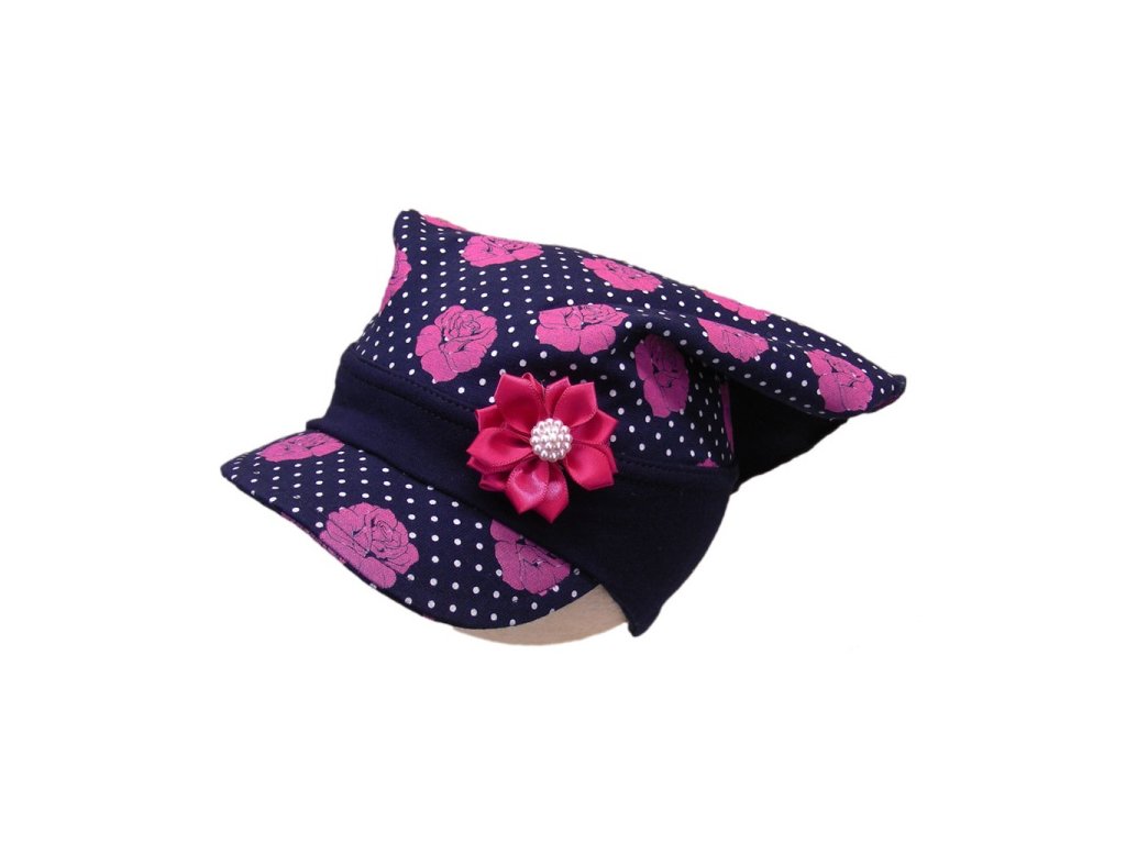 Dívčí šátek ušitý z pružného úpletu s kšiltem. Přes čelo dvouvrstvý patent s prodlouženým vykrojením na ouška je zdobený aplikací květu s perlovým středem.