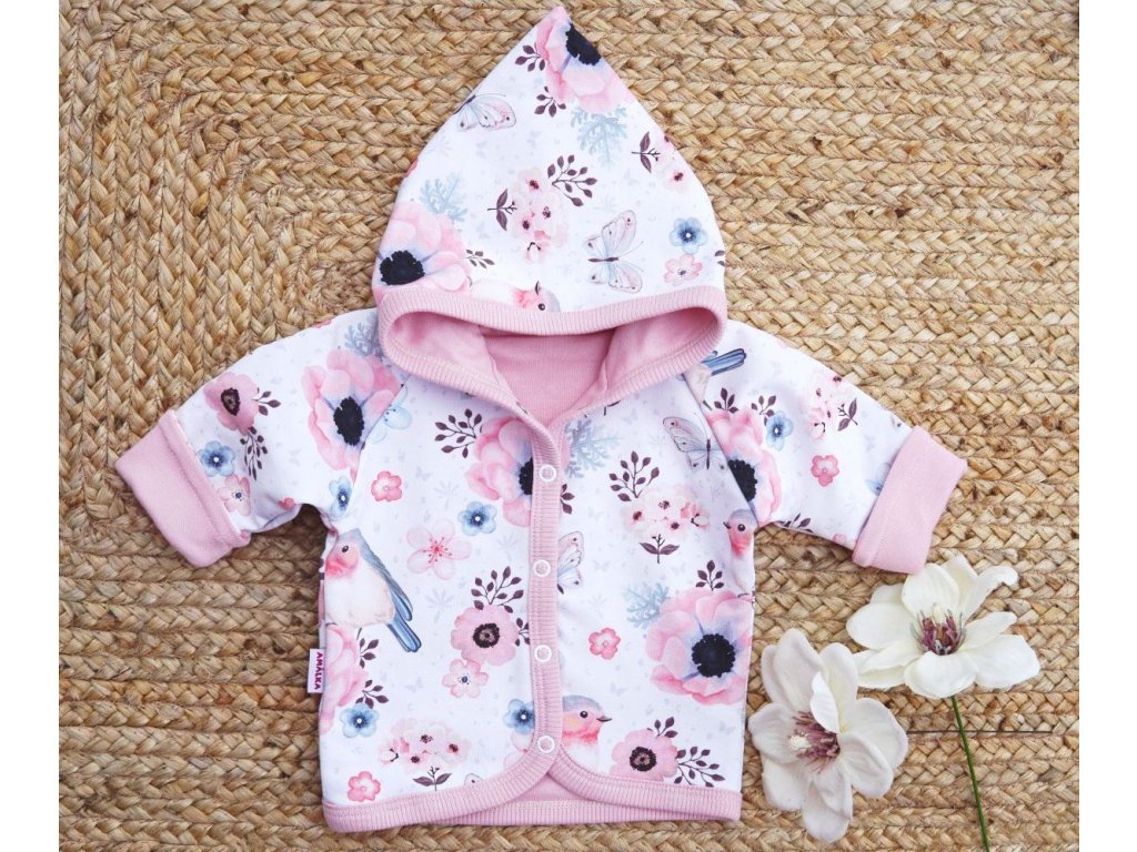 Kabátek je celopodšitý 100% bavlnou v pudrově růžové barvě.