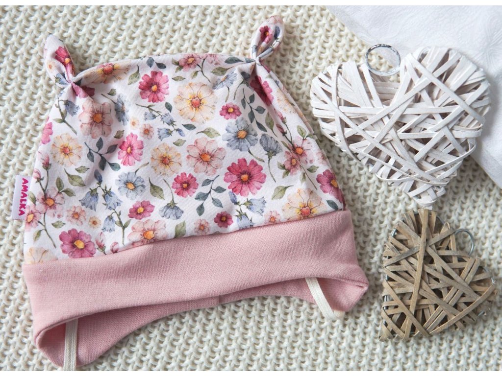 Krásná zavazovací čepička s ozdobnými oušky. Něžný, digitální potisk květinek. Velmi slušivá na hlavičce.