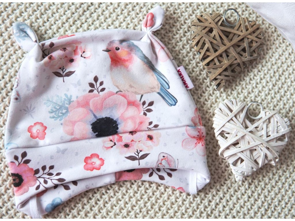 Kouzelná zavazovací čepička s ozdobnými oušky. Kvalitní, digitální potisk s něžnými ptáčky a květy. Velmi slušivá na hlavičce. Čepička bezvadně kryje...