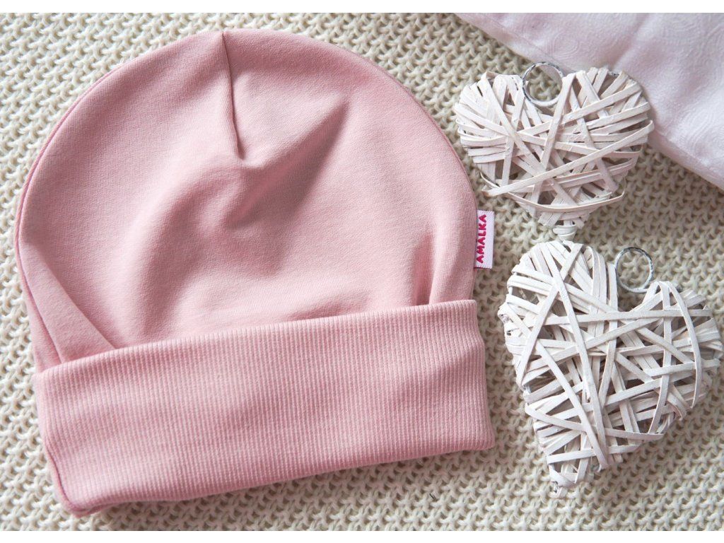 Elastická čepička s dvojitým přeloženým nápletem v pudrově růžové barvičce.