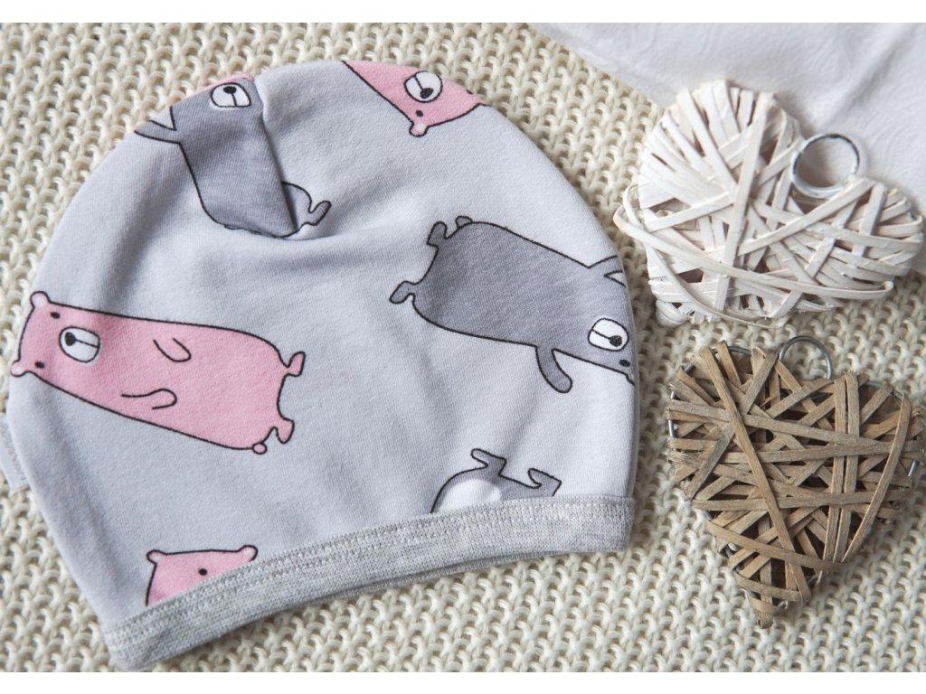 Elastická čepička saporka s medvídky, šedá/růžová