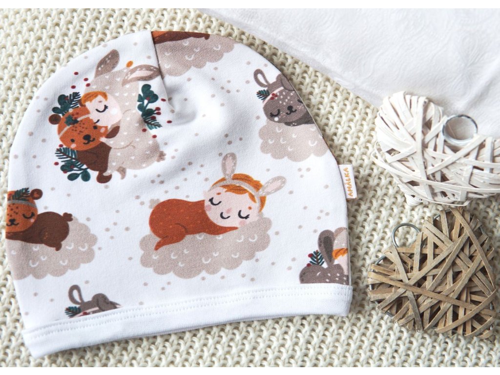 Klasická elastická jednovrstvá čepička saporka. Něžný digitální potisk spících zvířátek na obláčku.