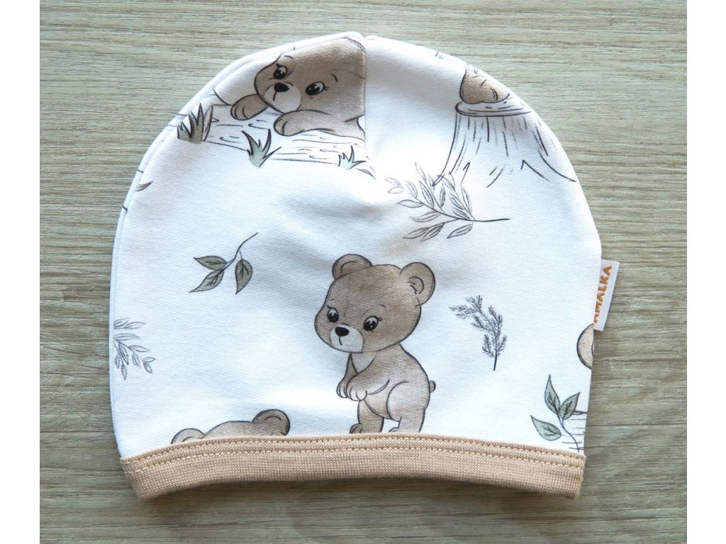 Klasická, elastická, jednovrstvá čepička saporka. Něžný, digitální potisk medvídka v béžové barvě...