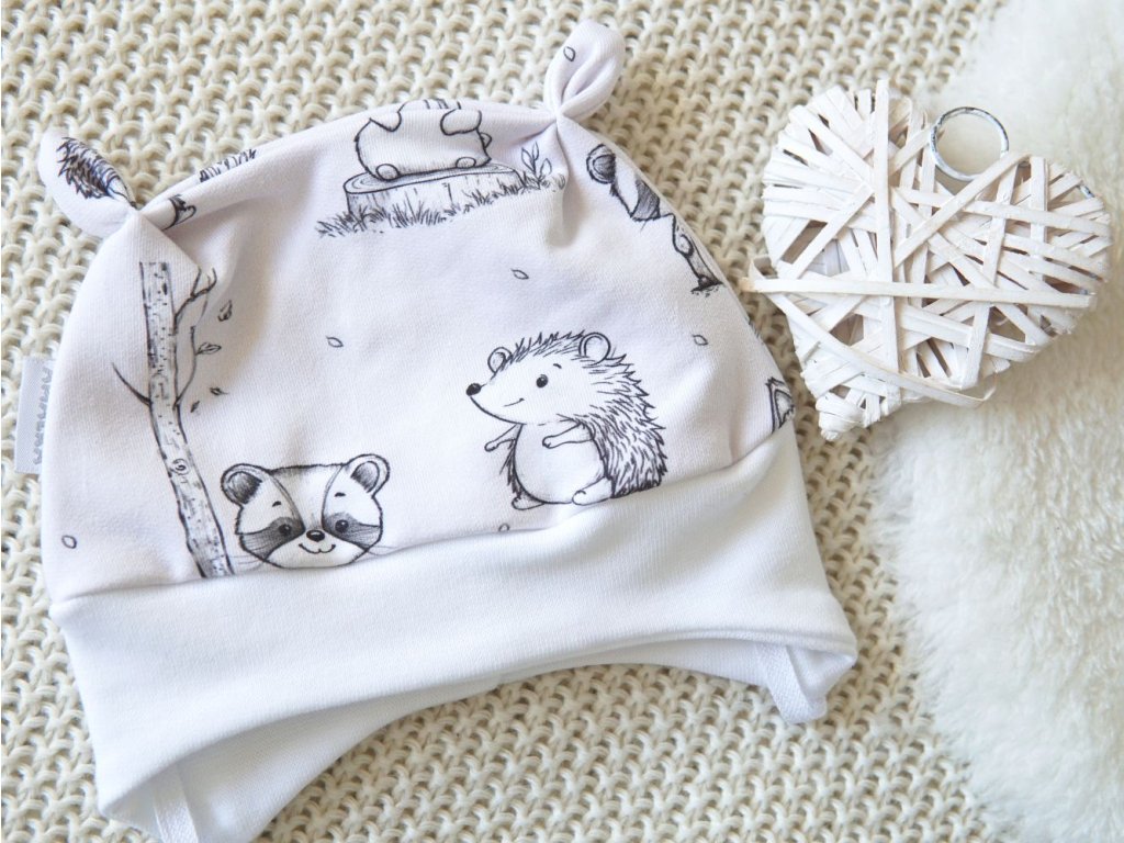 Krásná zavazovací čepička s ozdobnými oušky. Něžný, digitální potisk roztomilých, zvířecích kamarádů. Velmi slušivá na hlavičce.