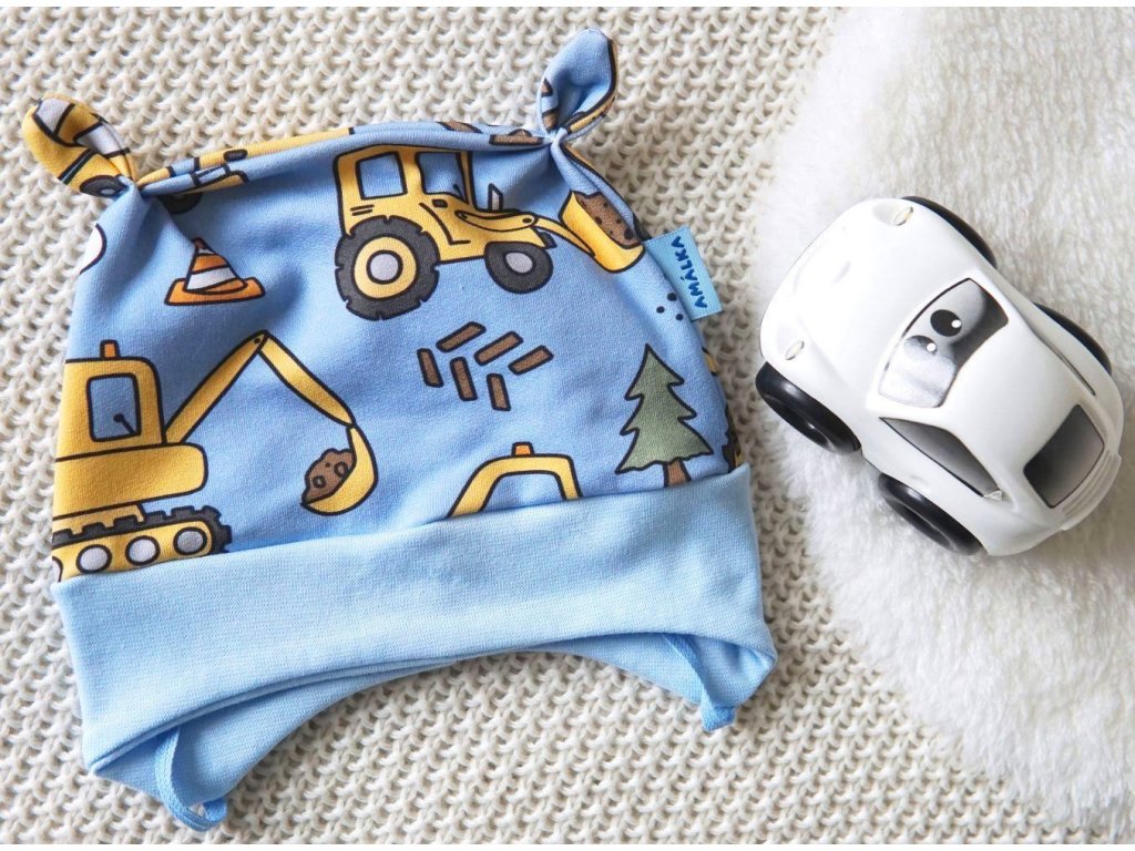 Kvalitní zavazovací čepička s ozdobnými oušky. Originální, digitální potisk stavebních aut, který okouzlí každého malého klučinu. Velmi slušivá na hlavičce. Čepička bezvadně..