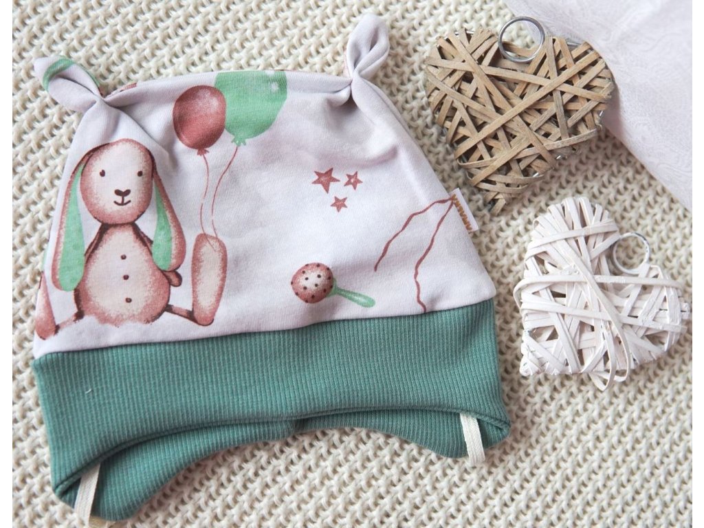 Kvalitní zavazovací čepička s ozdobnými oušky. Originální, digitální potisk roztomilých hraček a zvířátek s balónky.
