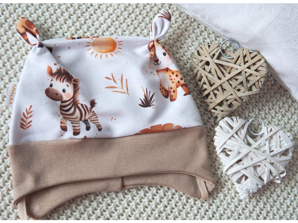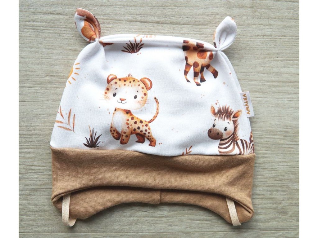 Kvalitní zavazovací čepička s ozdobnými oušky. Originální, digitální potisk rozkošných zvířátek Safari. Velmi slušivá na hlavičce.