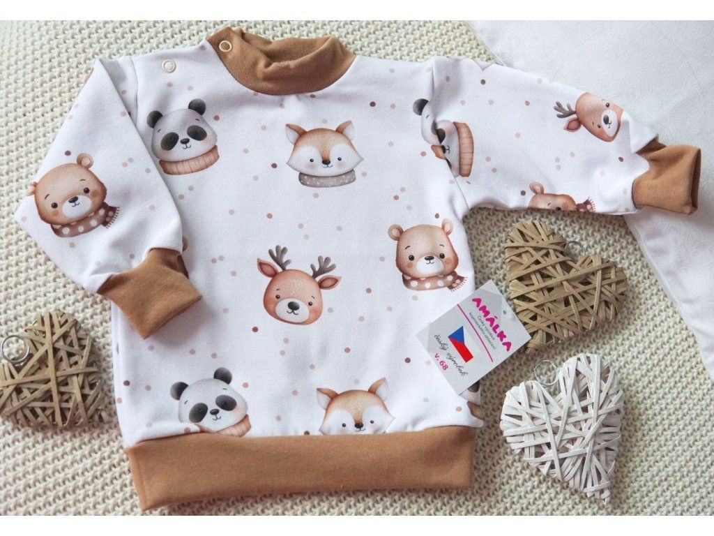 Krásná, kvalitní mikina v elastické teplákovině. Digitální potisk rozkošných zvířátek, který okouzlí každé miminko. U krku propínací na baby patenty.