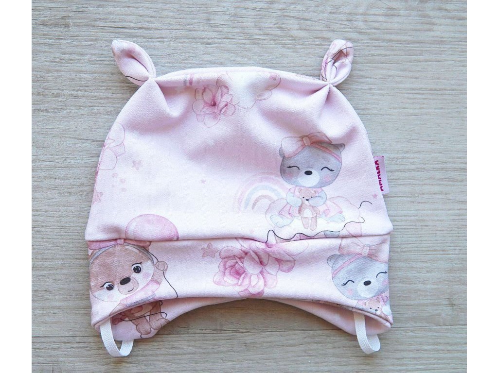 Kvalitní zavazovací čepička s ozdobnými oušky. Něžný, digitální potisk roztomilé medvědí holčičky. Velmi slušivá na hlavičce. Čepička bezvadně kryje i...