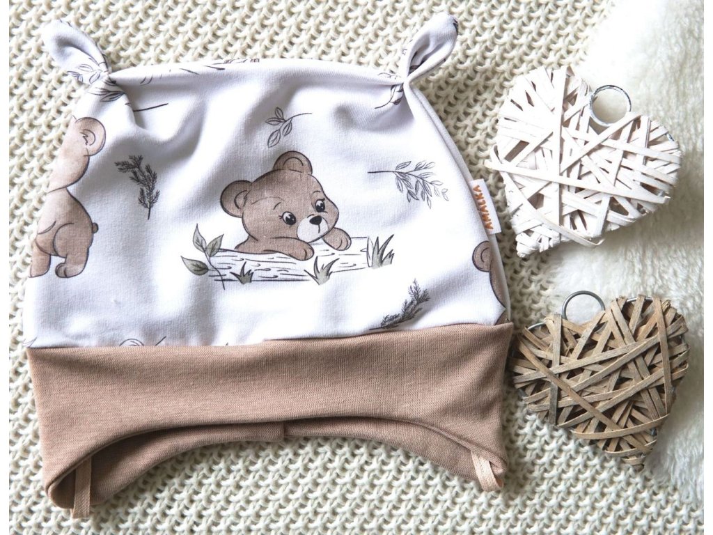 Kvalitní zavazovací čepička s ozdobnými oušky. Kouzelný digitální potisk medvídka. Velmi slušivá na hlavičce. Čepička bezvadně kryje i ouška..