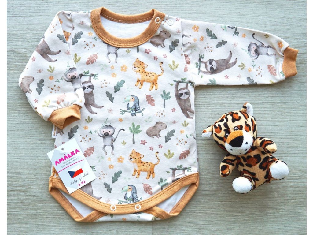 Kvalitní elastické body s dlouhým rukávem. Rozkošný, digitální potisk zvířátek safari. Propínání u krku a v rozkroku na dva..