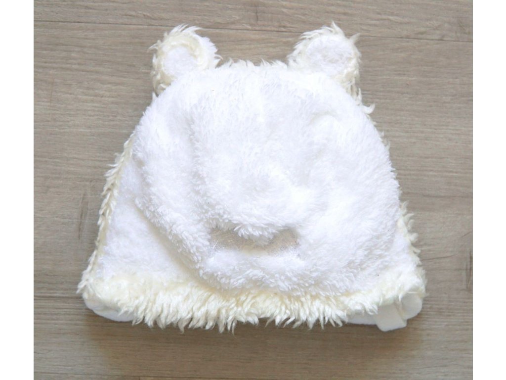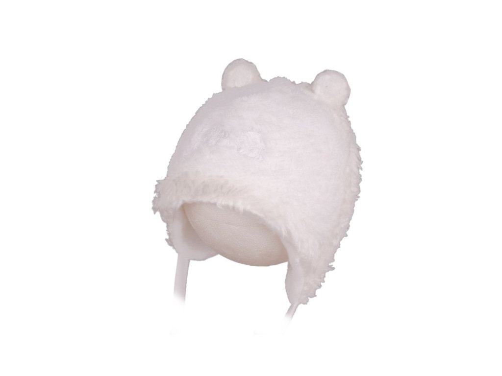 Dětská čepice zimní se šňůrkami v bílé barvě a smetanovou kombinací po obvodu čepičky.