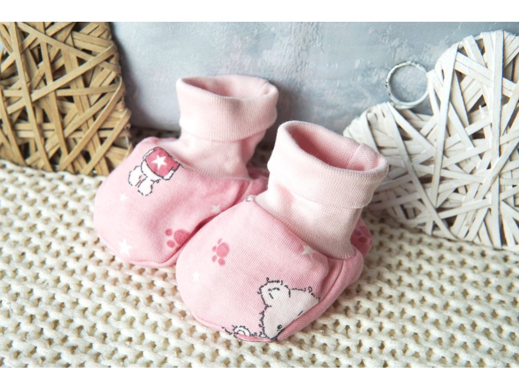 Kojenecké capáčky z jemného, bavlněného materiálu v něžném potisku růžového medvídka.