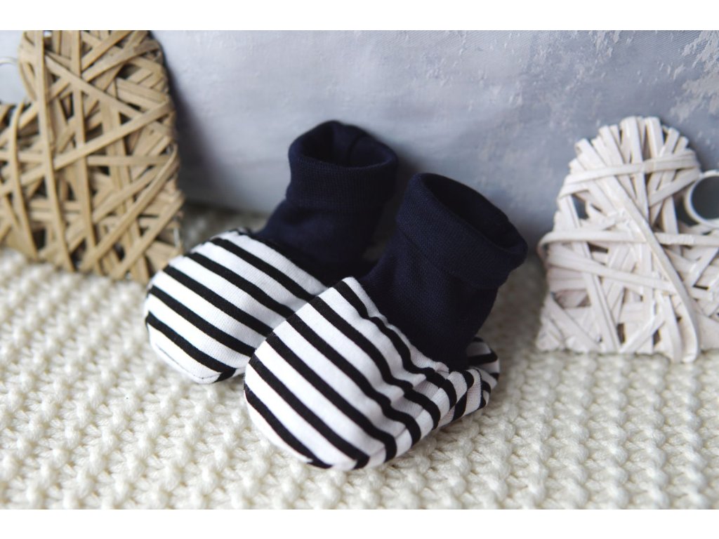 Kojenecké capáčky z jemného bavlněného materiálu v černo - bílých pruzích. Elastický náplet pěkně drží a obepíná nožku miminka.
