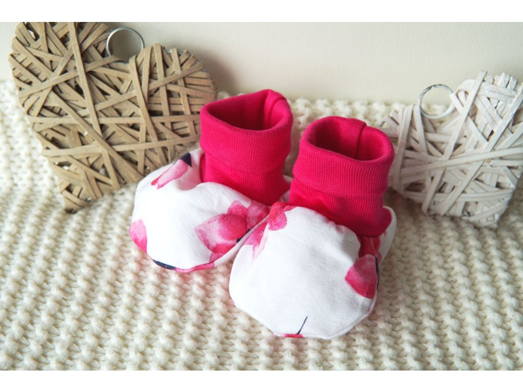 Kvalitní, kojenecké capáčky z elastického bavlněného materiálu jersey. Kouzelný digitální potisk malinových květů. Elastický náplet pěkně drží a obepíná nožku.