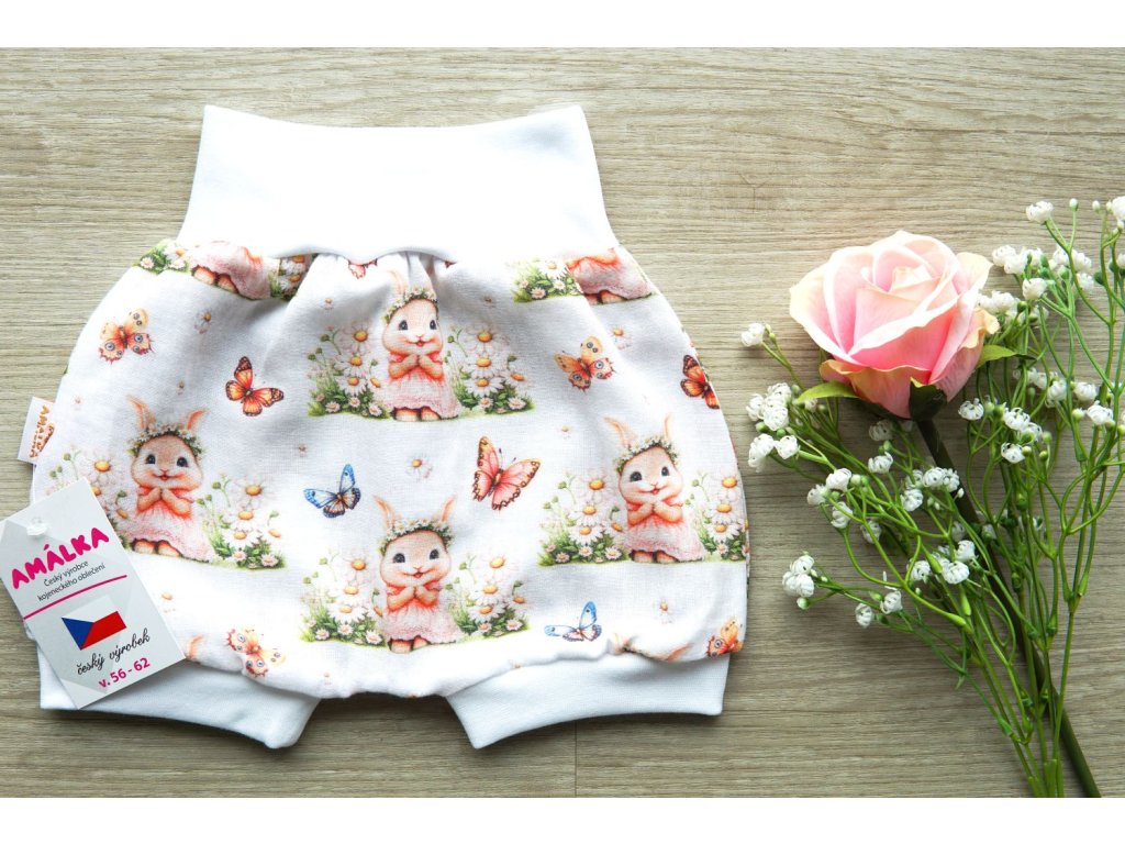 Kvalitní, bavlněné, letní kraťásky z prodyšného a vzdušného mušelínu - 100% bavlna. Roztomilé oblečení pro holčičky. Nádherný vzor králíčka v letní zahradě plné květin a motýlků.