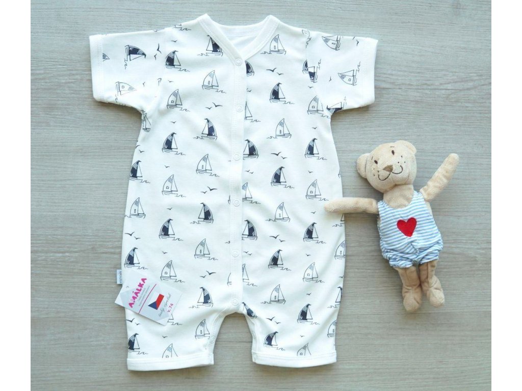 Pohodlný, letní, krátký overal z příjemné 100% bavlny. Kouzelný potisk s lodičkami ve smetanové barvičce. Overal má krátké rukávky a nohavičky....