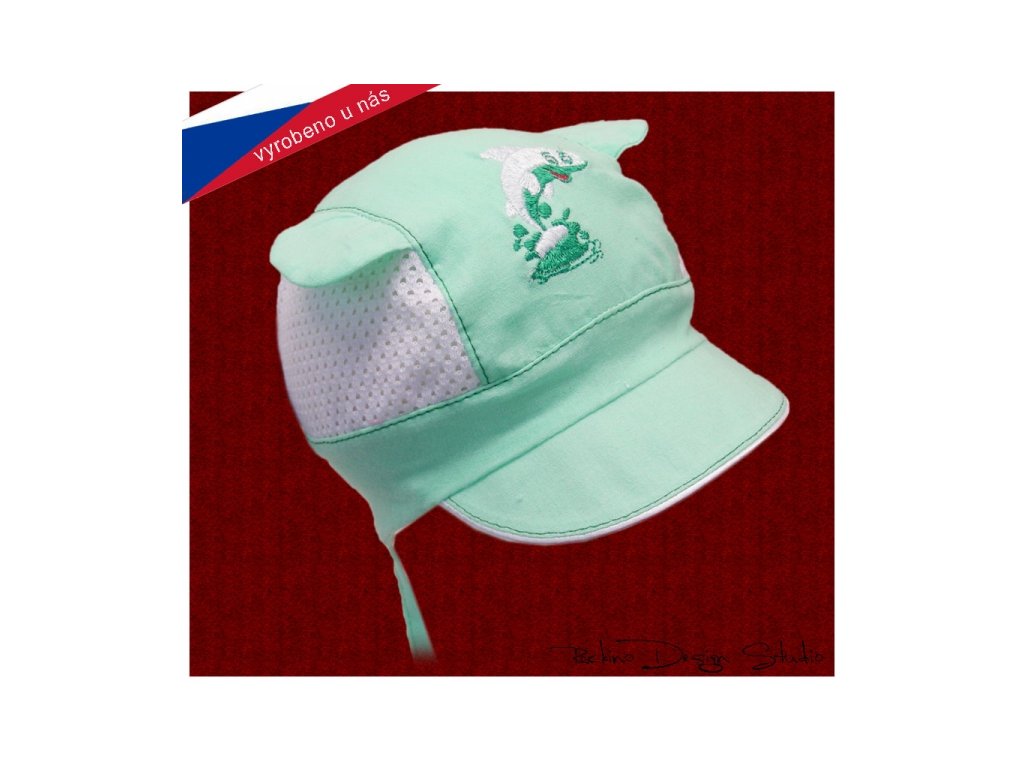 Letní kšiltovka z lehké, jemné bavlny s prodlouženým vykrojením na ouška se šňůrkami. Větrací síťka po stranách a výšivka delfínka. Kšilt zdobený výpustkem do barvy výšivky. V zadní části všitý proužek pružného úpletu.