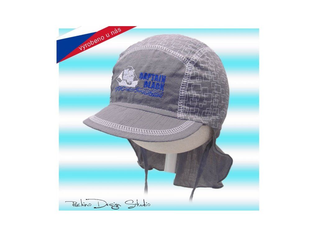 Letní chlapecká kšiltovka s protisluneční plachetkou z lehké, jemné, krešované bavlny s kšiltem a šňůrkami.