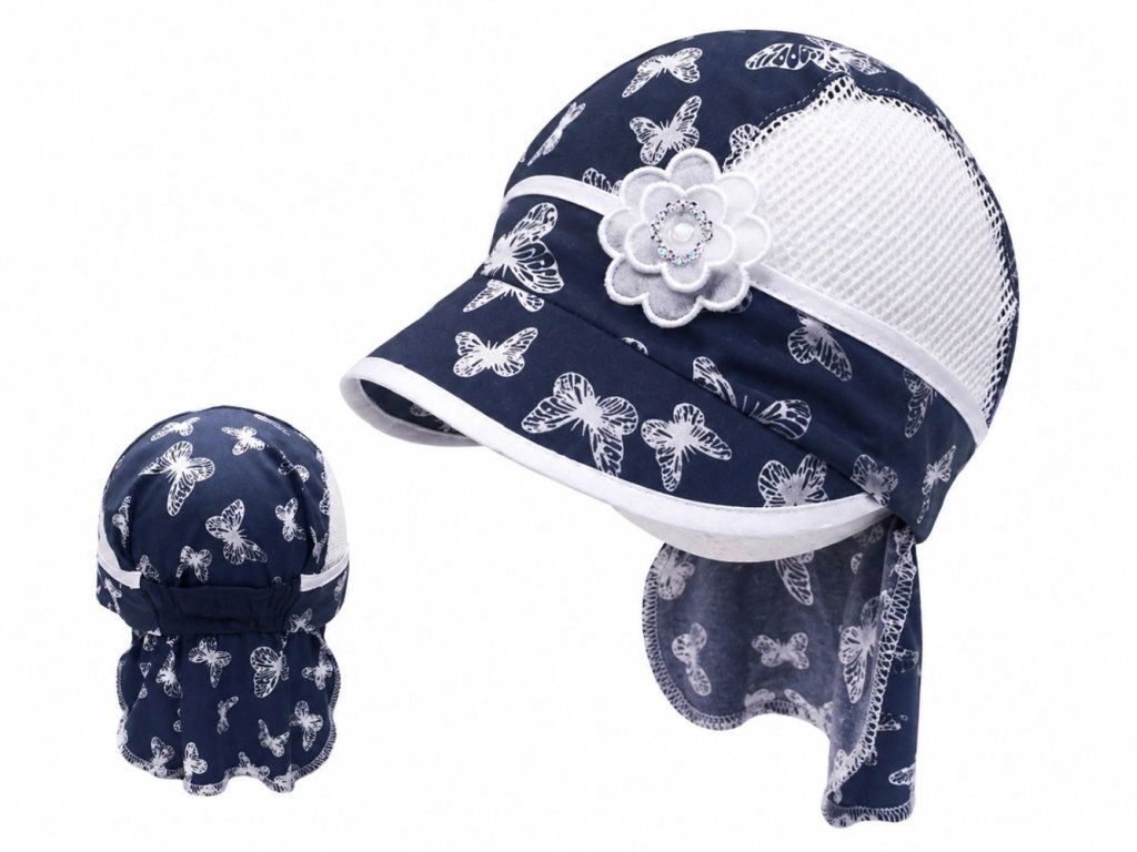 Letní dívčí čepice vybavená plachetkou z velmi jemné riflovinky. S kšiltem, zdobená stuhou a aplikací kytky se stříbrnými flitry. Po stranách všité bavlněné síťky pro dobré větrání modelu v teplých letních dnech. V zadní části proužek úpletu, který umožňuje prodloužení obvodu až o 5 cm.