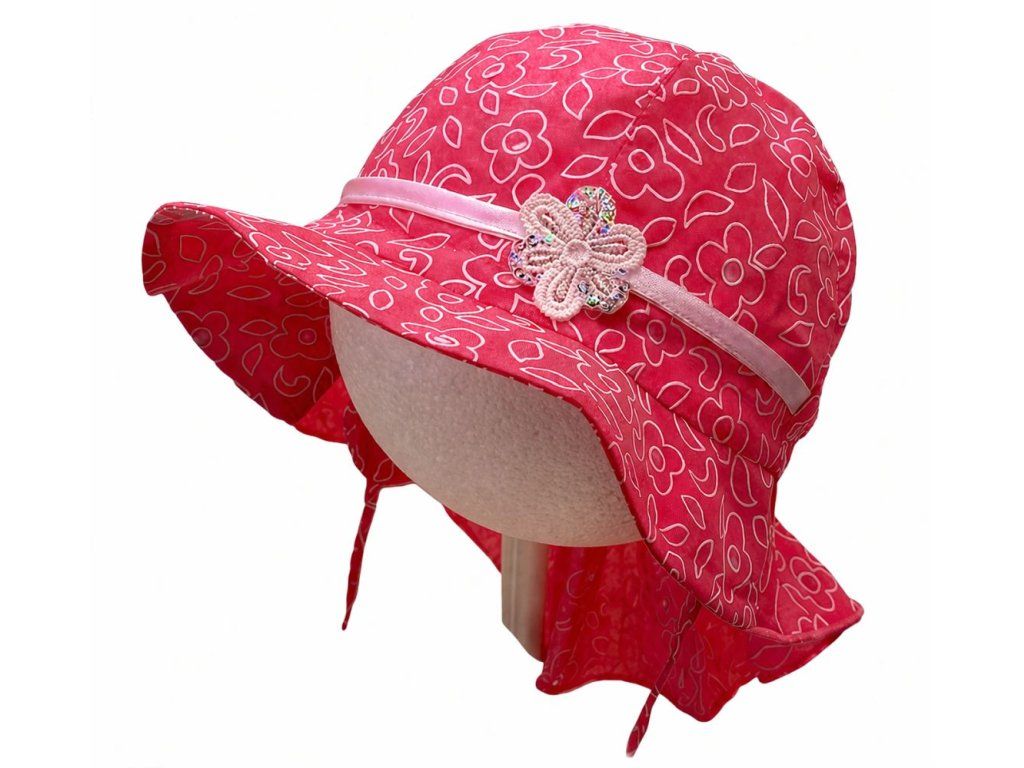 Letní dívčí klobouček z bavlněného plátna, potištěného květy. Klobouček je opatřený klapkami na ouška se šňůrkami.