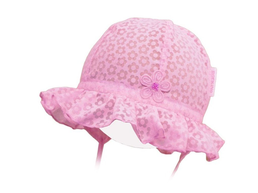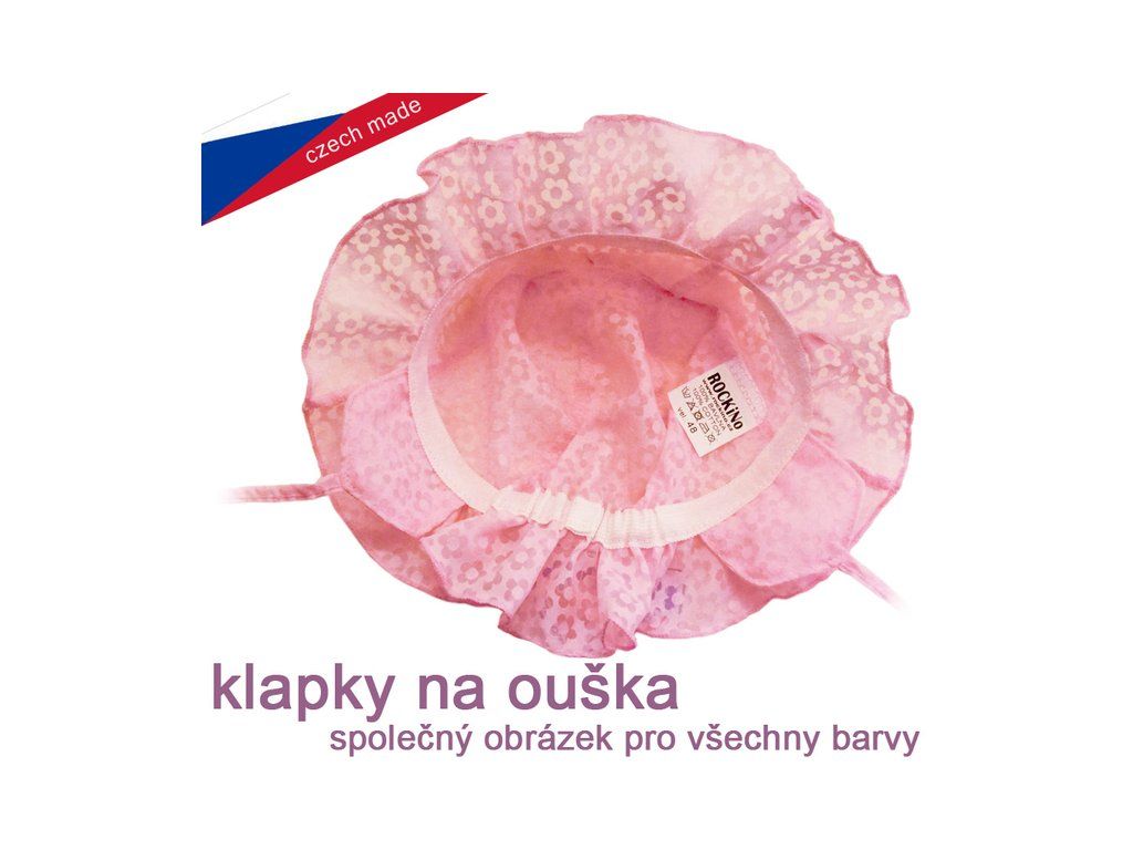 Letní dívčí klobouček z velmi tenké letní bavlny. Klobouček je opatřený klapkami na ouška se šňůrkami. Aplikace vyšívaného květu.