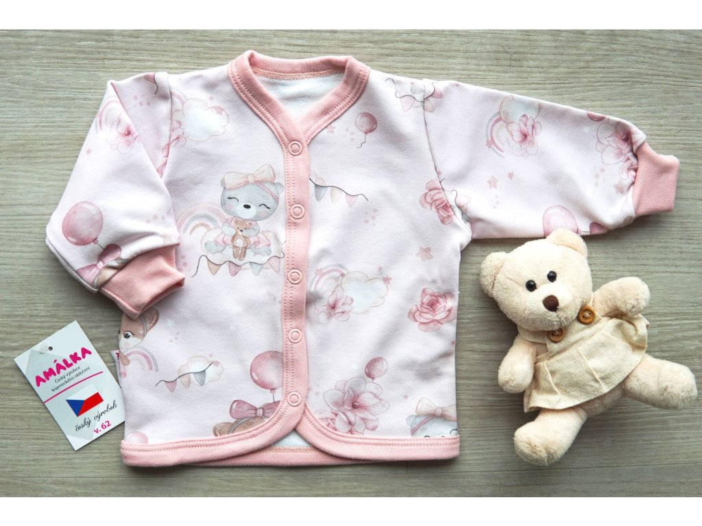 Kvalitní, kojenecký kabátek neboli mikina z elastické teplákoviny. Kouzelný, digitální potisk medvědí holčičky v pudrově růžové barvě.