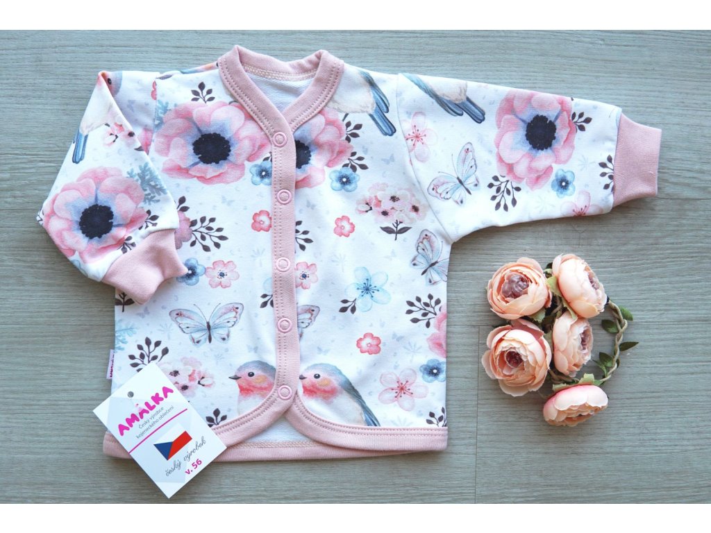 Kvalitní kojenecký kabátek nebo-li tenčí mikina z přijemné elastické bavlny. Kouzelný digitální potisk s ptáčky a květy. Mikinka je vhodná pro...