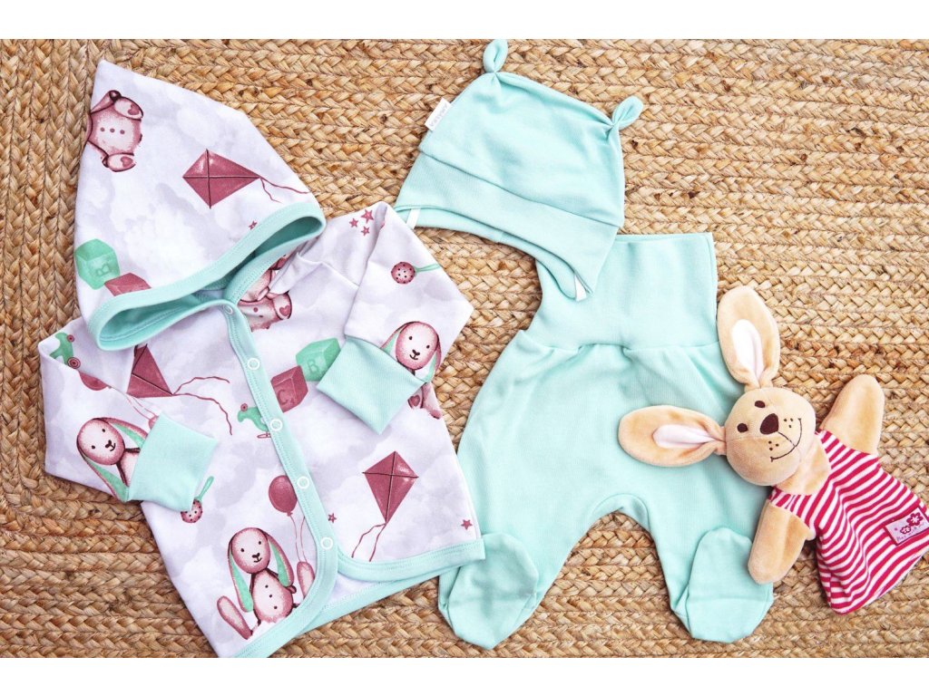 3-dílná souprava pro miminko obsahuje designe sladěné oblečky v neutrálních barvách: