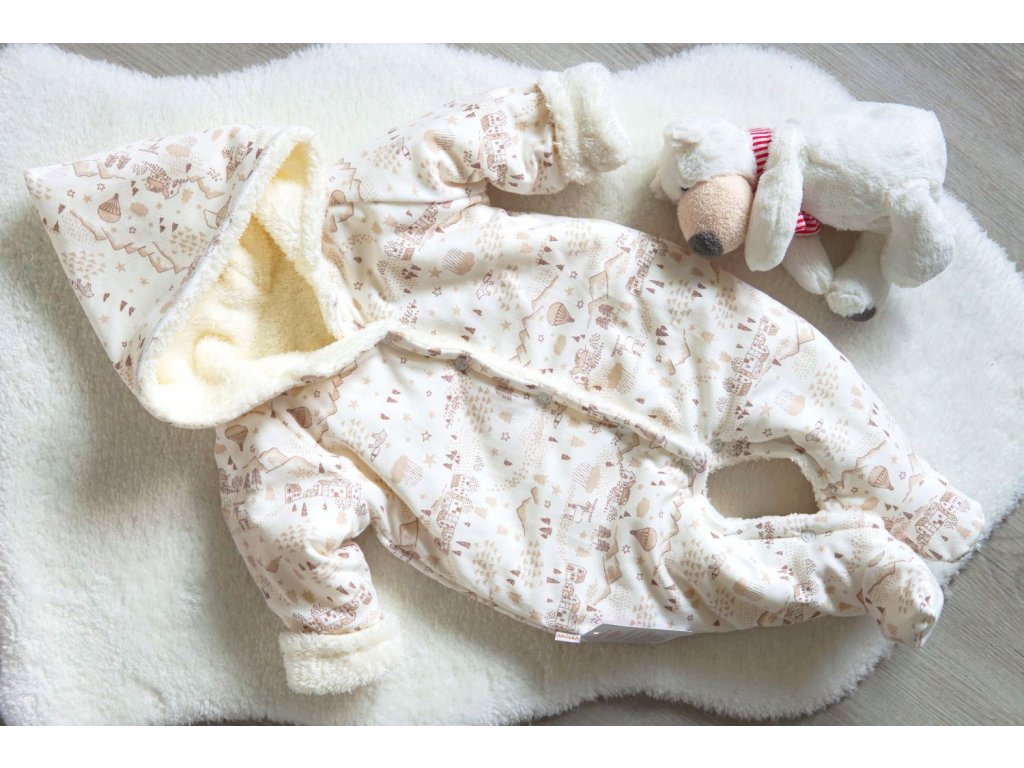 Krásná kombinézka pro miminko od podzimu do jara. Vrchní materiál je bavlněný. Kouzelný potisk pohádkové krajiny v oříškové barvičce. Zateplená...