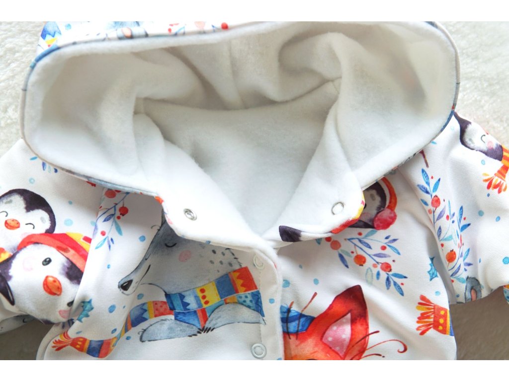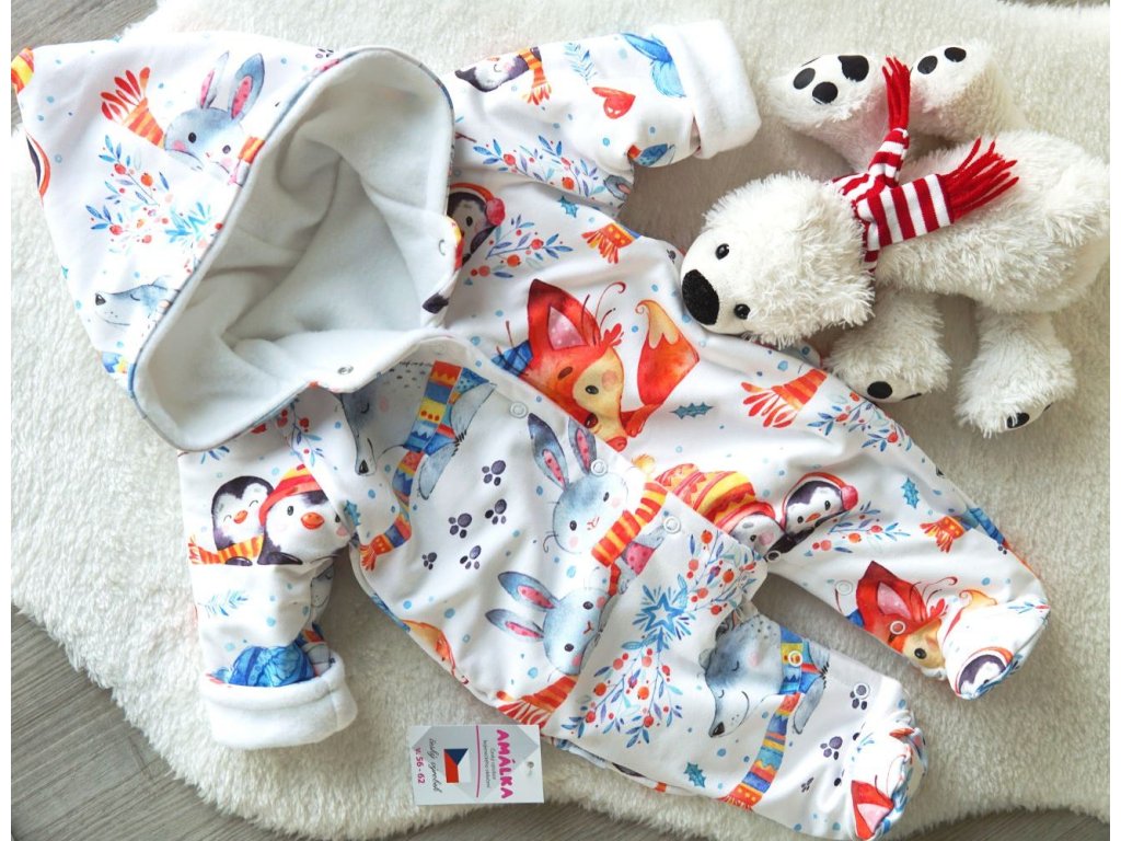 Krásná kombinézka pro miminko od podzimu do jara. Vrchní materiál je bavlněný, kvalitní, digitální potisk s rozkošnými zvířátky. Zateplená teploučkým fleecem.