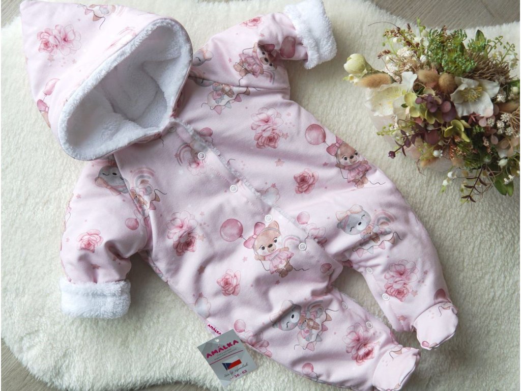 Krásná kombinézka pro miminko od podzimu do jara. Vrchní materiál je bavlněný, kvalitní teplákovina v digitálním potisku něžné postavičky medvědí holčičky s balónky a květy..