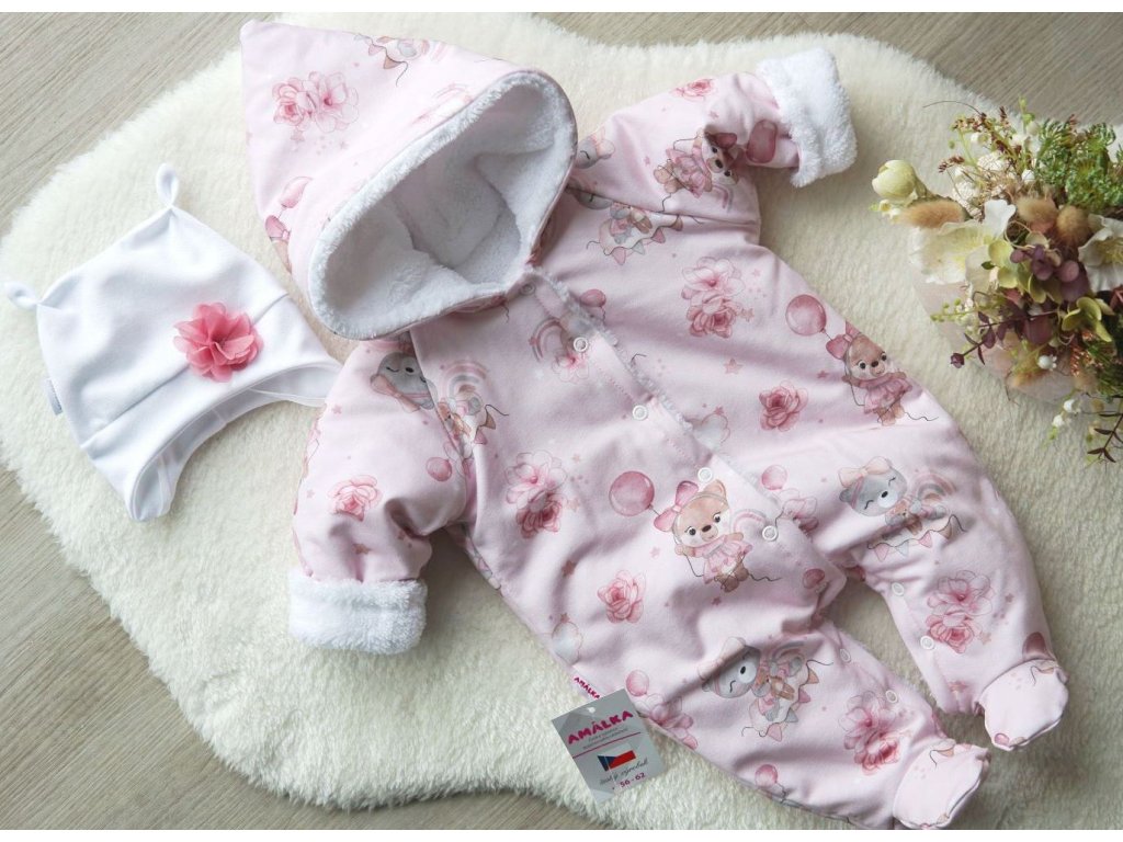 Zateplená růžová kombinéza s čepičkou, medvědí holčička