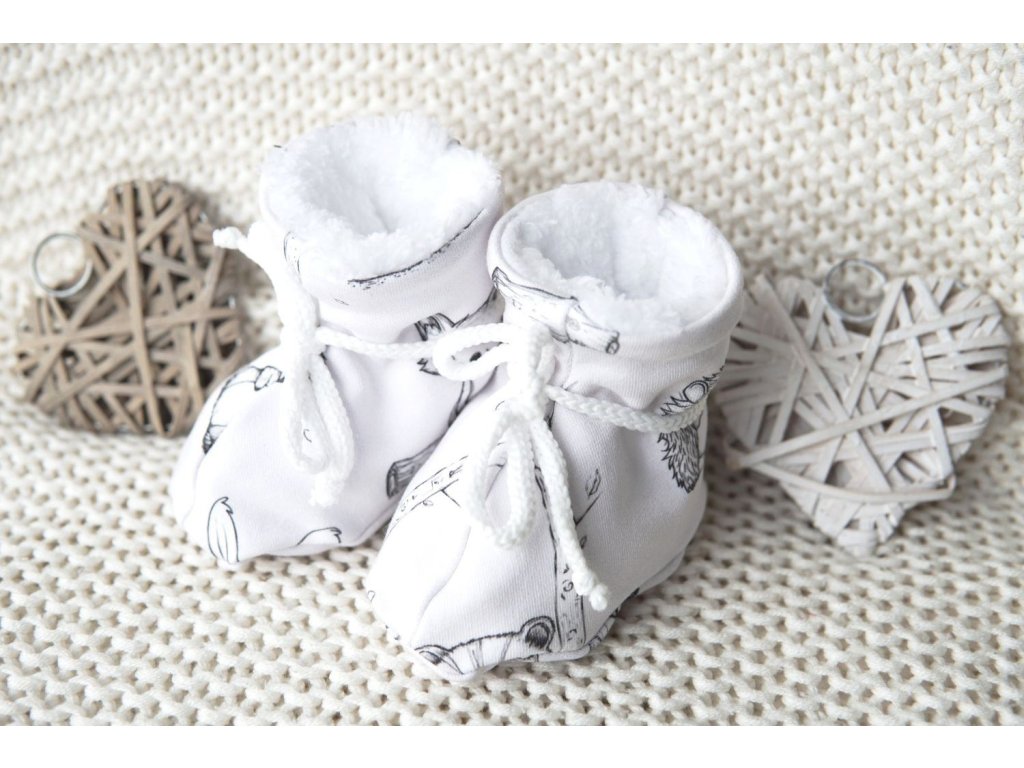 Bačkůrky pro miminko, podšité teploučkou chlupatkou bílé barvy. Zavazování na šňůrky přes nožku. Kouzelný digitální potisk zvířecích kamarádů.