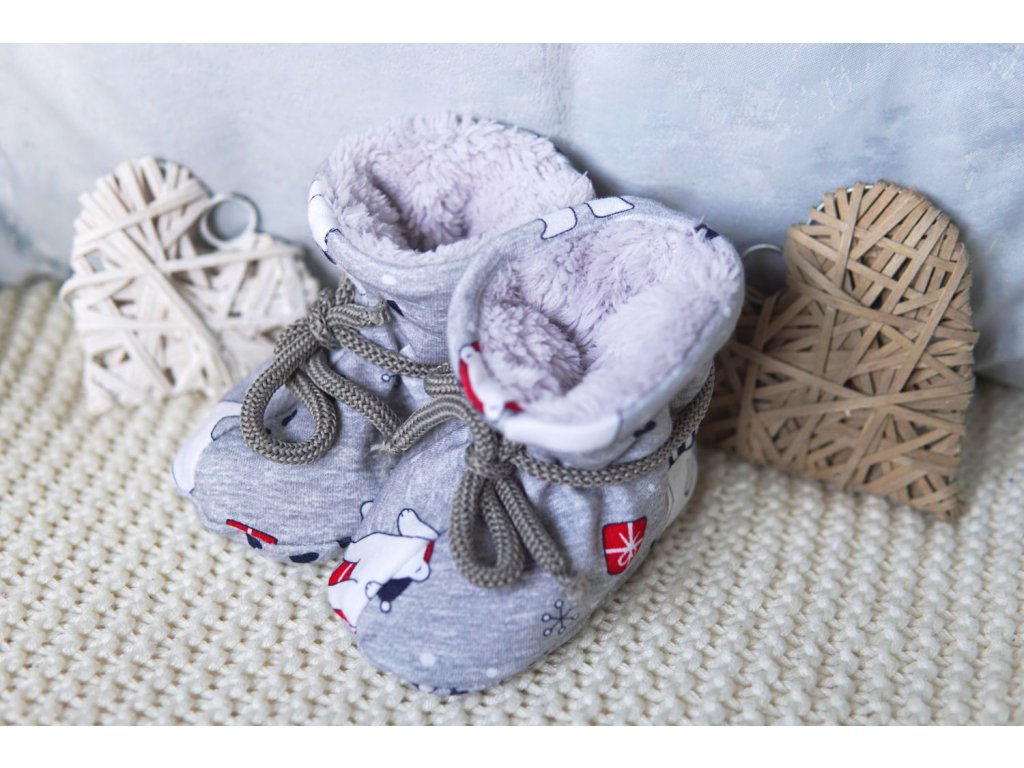Zateplené bačkůrky podšité hřejivou chlupatkou. Zavazování na šňůrky přes nožku. Kouzelný potisk v šedé barvičce.