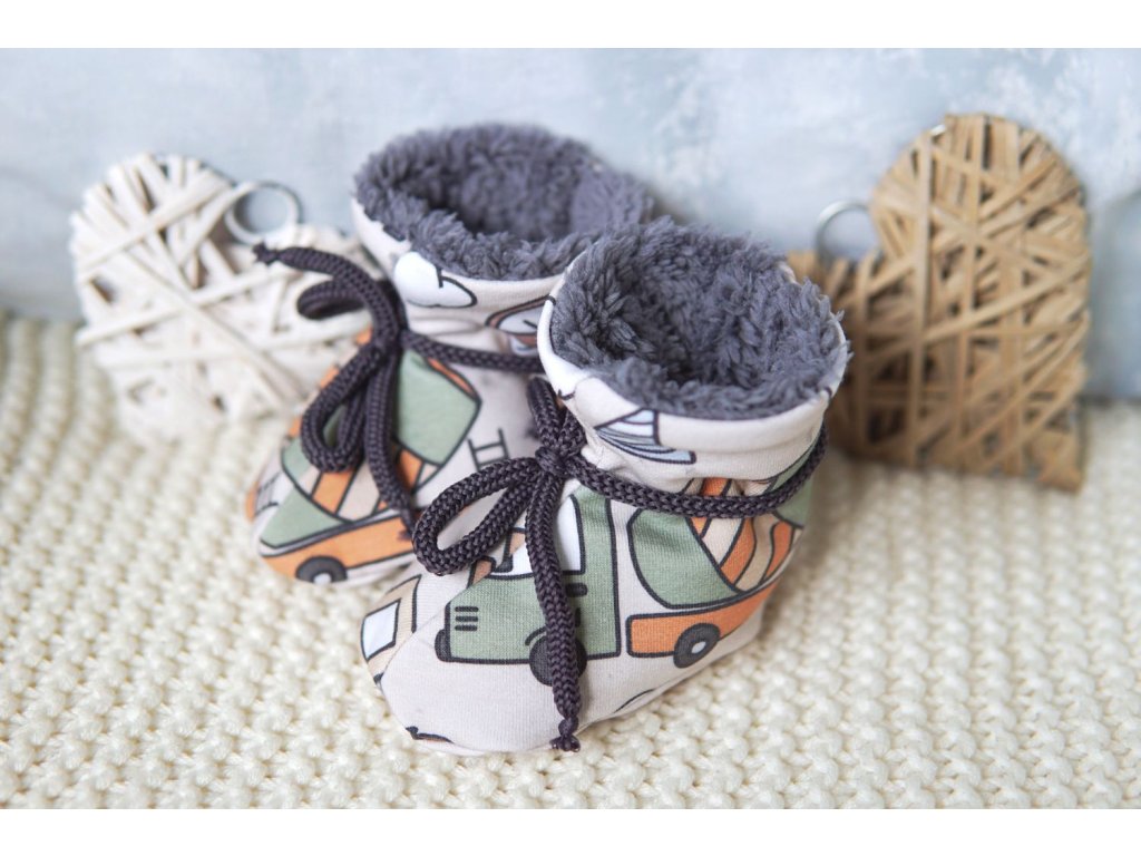 Bačkůrky pro miminko, podšité teploučkou chlupatkou tmavě šedé barvy. Zavazování na šňůrky přes nožku. Digitální potisk s bagry.