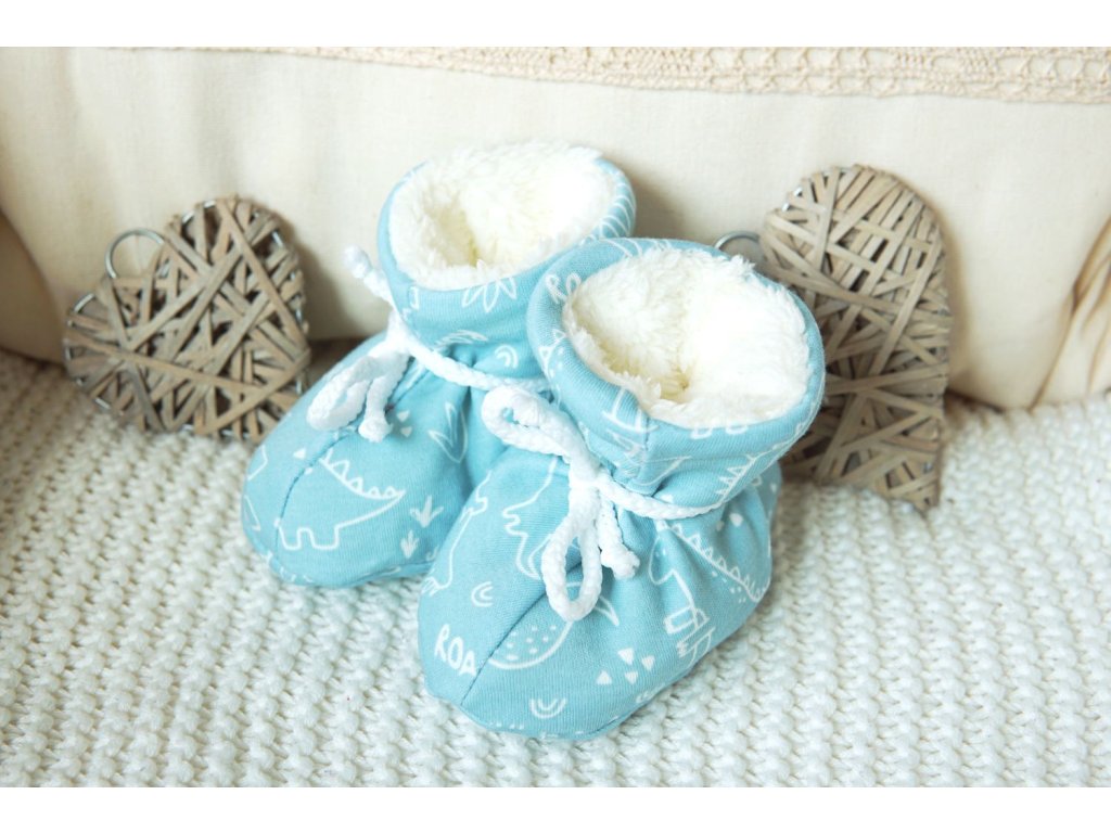 Kojenecké bačkůrky podšité chlupatkou smetanové barvy. Zavazování na šňůrky přes nožku. Kouzelný, jemný potisk zvířátek dinoparku. Teploučké, ochrání..