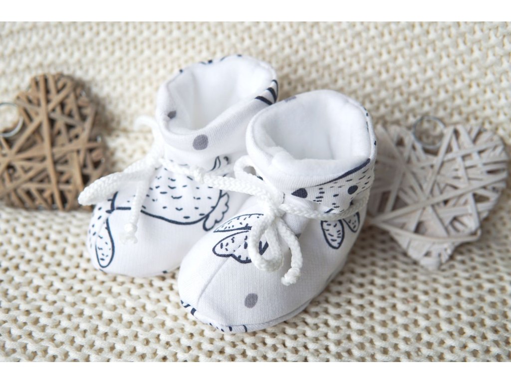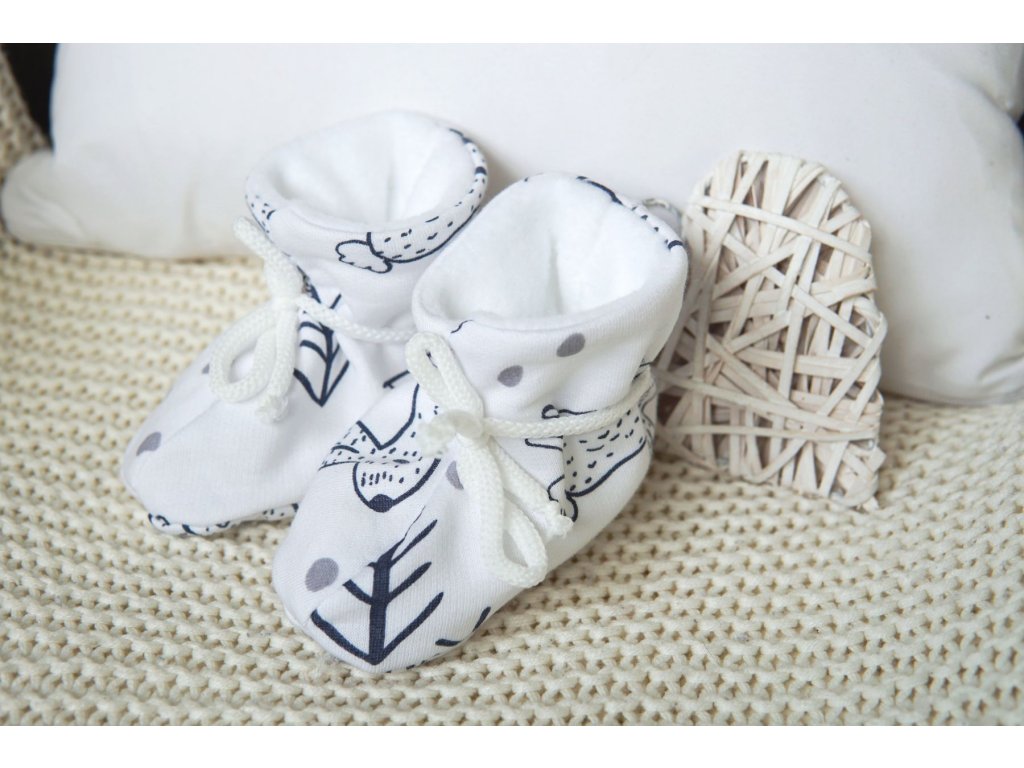 Bavlněné bačkůrky podšité fleecem bílé barvy. Zavazování na šňůrky přes nožku. Kouzelný potisk zajíčka v lese. Teploučké, ochrání Vaše miminko před...