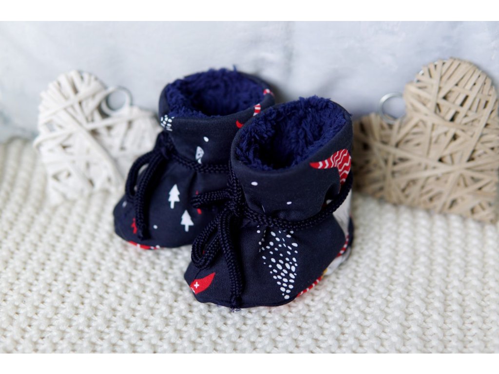 Zateplené bačkůrky podšité hřejivou chlupatkou. Zavazování na šňůrky přes nožku. Kouzelný potisk skřítků v temně modré barvičce. Teploučké,...