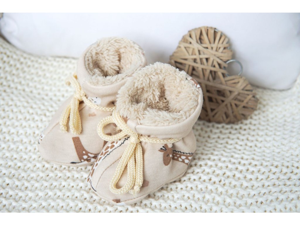Kojenecké bačkůrky podšité chlupatkou oříškové barvy. Zavazování na šňůrky přes nožku. Kouzelný potisk zvířátka žirafy. Teploučké, ochrání Vaše...