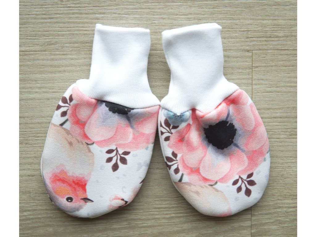 Rukavičky bez palečku pro Vaše miminko. Vrchní materiál je bavlněný, v něžném potisku s květy a ptáčky. Podšité teploučkým fleecem.