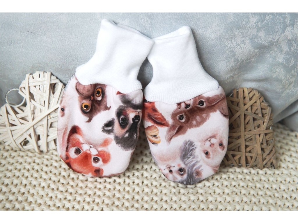 Rukavičky bez palečku pro Vaše miminko. Vrchní materiál je bavlněný, v něžném potisku zvířátek. Podšité teploučkým fleecem.