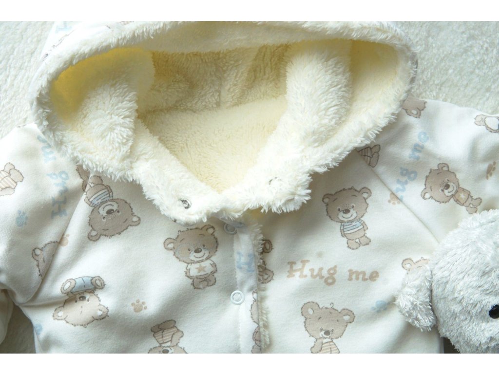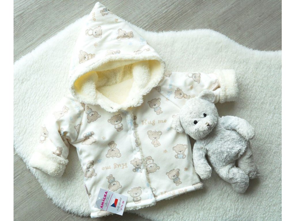 Kvalitní celopodšitý, dvojitý kabátek s kapucí.  Něžný potisk s medvídky ve smetanové barvě. Propínání na baby patentky.